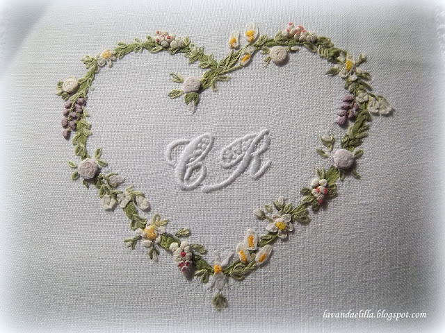 Un cuore ricamato alcuni anni fa con i nastrini di seta su un cuscino